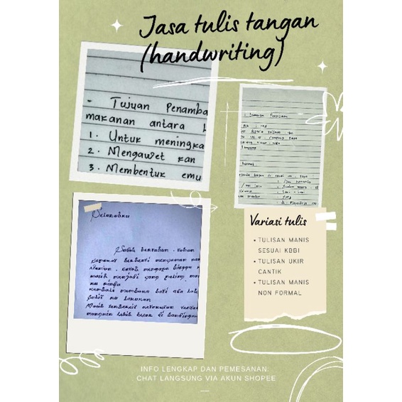 Cari harga dan promo terbaik untuk jasa tulisan tangan diantara 213 produk. Nah, menulis huruf tegak bersambung yang baik dan benar membuat tulisan tersebut indah. Tentunya hasil tulisan yang anda buat akan ditampilkan dengan sensasi dan bentuk hasil tulisan tangan. Kalian cuman tinggal tunggu dan jeng jeng tulisan .